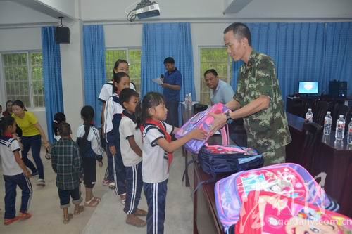 圖為官兵正將捐贈(zèng)的書包遞交到學(xué)生手中
