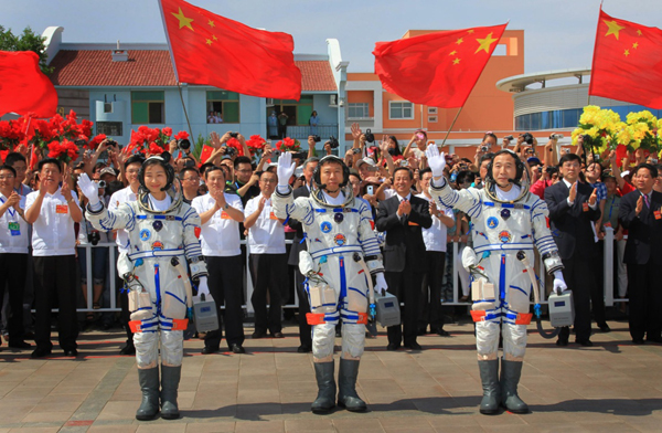 ????2012年6月16日,神舟九號航天員出征儀式在酒泉衛(wèi)星發(fā)射中心航天員公寓問天閣舉行,航天員景海鵬、劉旺、劉洋(從右至左)向歡送人群揮手致意。新華社記者 李剛 攝