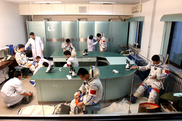 ????2002年6月17日,航天員在進行穿脫訓練。新華社發(fā)