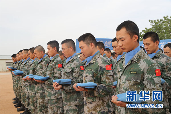 祭奠儀式上,大型機械鳴笛三聲,哀思樂曲響起,全體官兵整裝列隊,集體脫帽為犧牲在維和戰(zhàn)場上的英烈默哀三分鐘。隨后,官兵代表致辭,追憶維和英烈們無私奉獻、舍生取義的光輝事跡,表達為達爾富爾地區(qū)和平建設而努力奮斗的堅定決心。