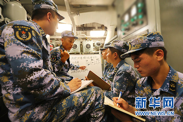 肖海生(左二)利用訓練間隙為戰(zhàn)友講解AIP系統(tǒng)常見故障及處置方法(2017年6月2日攝)。 新華社發(fā)(韓林 攝)