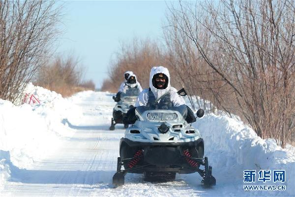 ????黑龍江東極哨所官兵騎摩托雪橇在黑瞎子島上巡邏(2018年1月31日攝)。新華社記者 琚振華 攝