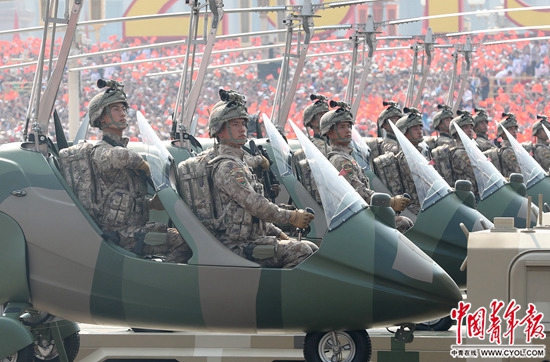 10月1日,慶祝中華人民共和國(guó)成立70周年大會(huì)上,裝備方隊(duì)官兵身著新式迷彩服接受檢閱。中國(guó)青年報(bào)·中國(guó)青年網(wǎng)記者 趙迪/攝
