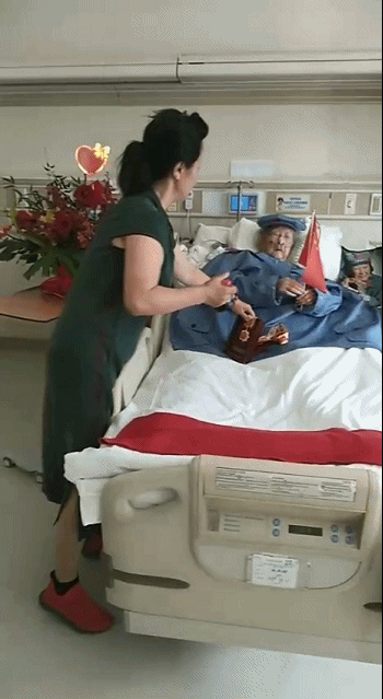 2019年10月1日,中華人民共和國迎來七十華誕。素來了解老人心思的陽瓊仙,專門帶了兩面國旗到病房里。閱兵開始后,滿頭銀發(fā)的王定國半躺在病床上,一手拿一面旗,隨著軍樂的節(jié)奏來回?fù)]舞,累了,歇一下,又接著揮,仿佛自己正身處天安門廣場熱情歡呼的人群中。