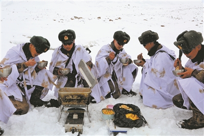????邊關(guān)冷,保障暖。某邊防團四級軍士長張震說:“在零下20多攝氏度的山尖尖,面條吸溜到肚里,胃里暖暖的,身上熱熱的!”(楊仁偉、孫興維)