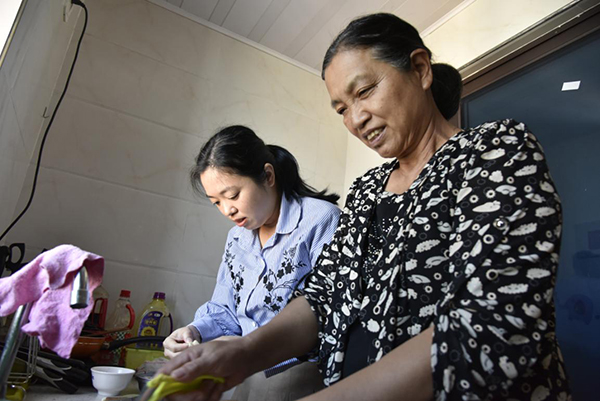 鄭如與老人一起做家務(wù)。