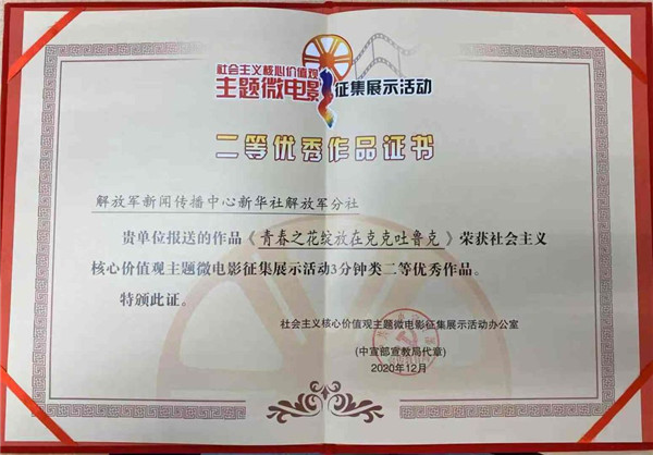 ????第四屆社會(huì)主義核心價(jià)值觀主題微電影征集展播活動(dòng)評(píng)選結(jié)果日前揭曉,解放軍新聞傳播中心新華社解放軍分社申報(bào)的《青春之花綻放在克克吐魯克》獲“3分鐘類二等優(yōu)秀作品獎(jiǎng)”。