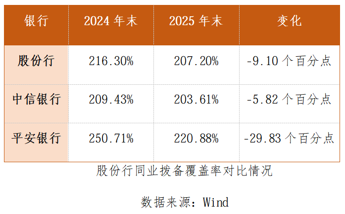 国家金融监督管理总局发布的2025年商业银行主要监管指标情况显示,行业拨备覆盖率整体水平在2024年四季度为211.19%,2025年四季度为205.21%;同期股份行的此项数据,由216.30%降至207.20%。