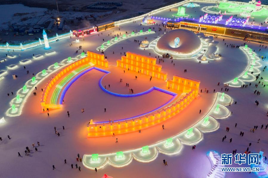 這是2021年1月1日拍攝的哈爾濱冰雪大世界園區(qū)一角(無人機(jī)照片)。