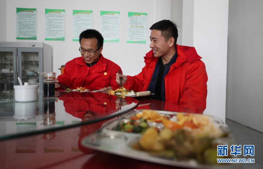 2月3日,在遼河油田建設(shè)有限公司管道第三項(xiàng)目部,來自河北衡水的概預(yù)算管理人員王殿凱(左)和來自河北邢臺的工程技術(shù)人員張浩在食堂吃飯。今年他們都留在當(dāng)?shù)剡^年。