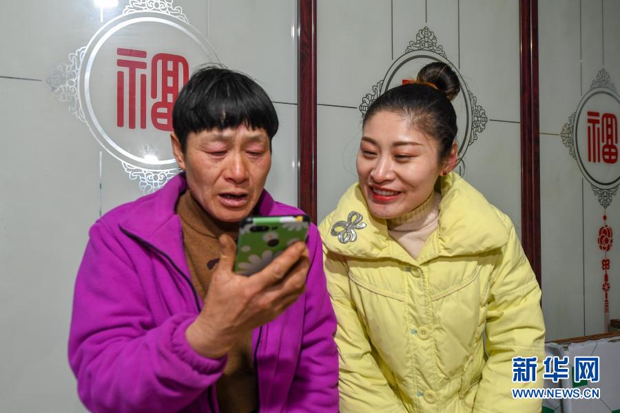 2月9日,在吉林省長春市農(nóng)安縣楊樹林鄉(xiāng)牛尾巴山村,付寶印的母親鐘士輝(左)與付寶印姐姐付寶賀用手機與付寶印視頻通話。新華社記者 張楠 攝