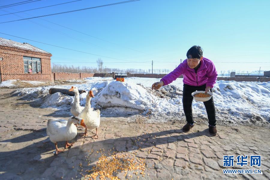 2月9日,在吉林省長春市農(nóng)安縣楊樹林鄉(xiāng)牛尾巴山村,付寶印的母親鐘士輝在喂鵝。新華社記者 張楠 攝