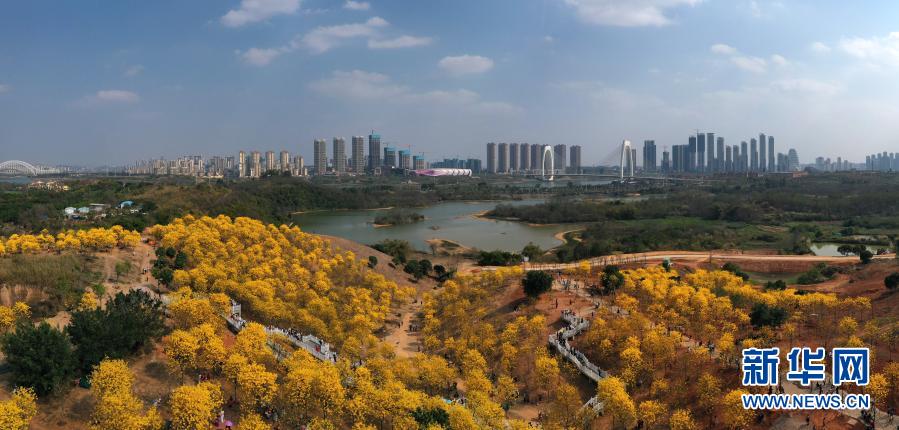這是南寧市青秀山風(fēng)景區(qū)盛開的黃花風(fēng)鈴木(2月21日攝,無(wú)人機(jī)照片)。