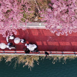 早春時節(jié),貴州省黔東南苗族侗族自治州錦屏縣三江鎮(zhèn)濱江步道櫻花盛開,吸引游人前來踏春賞花。
