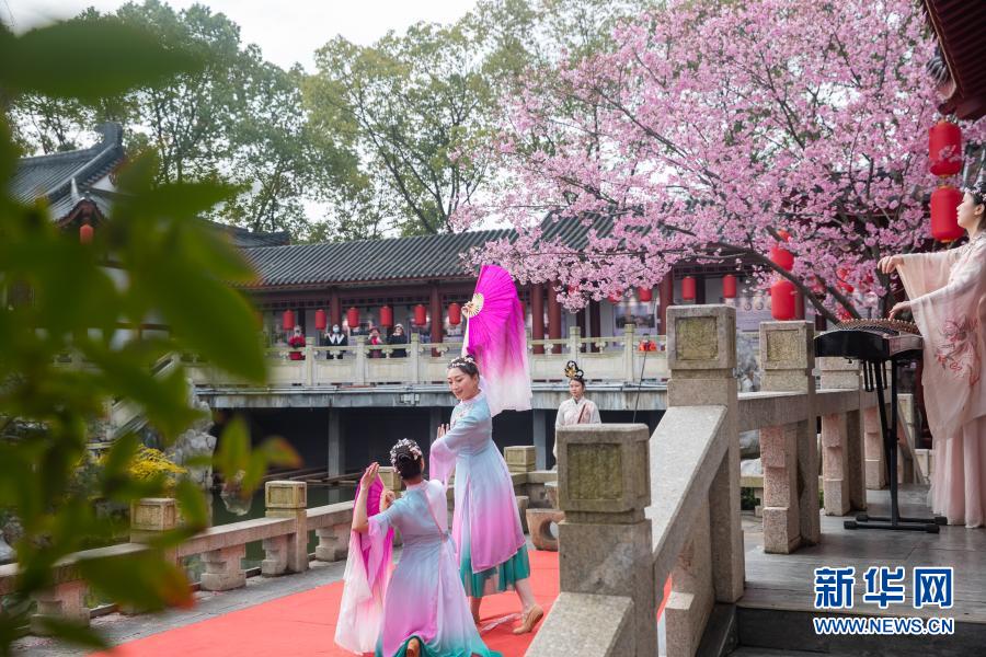 2月27日,演員在武漢東湖櫻花園表演節(jié)目。