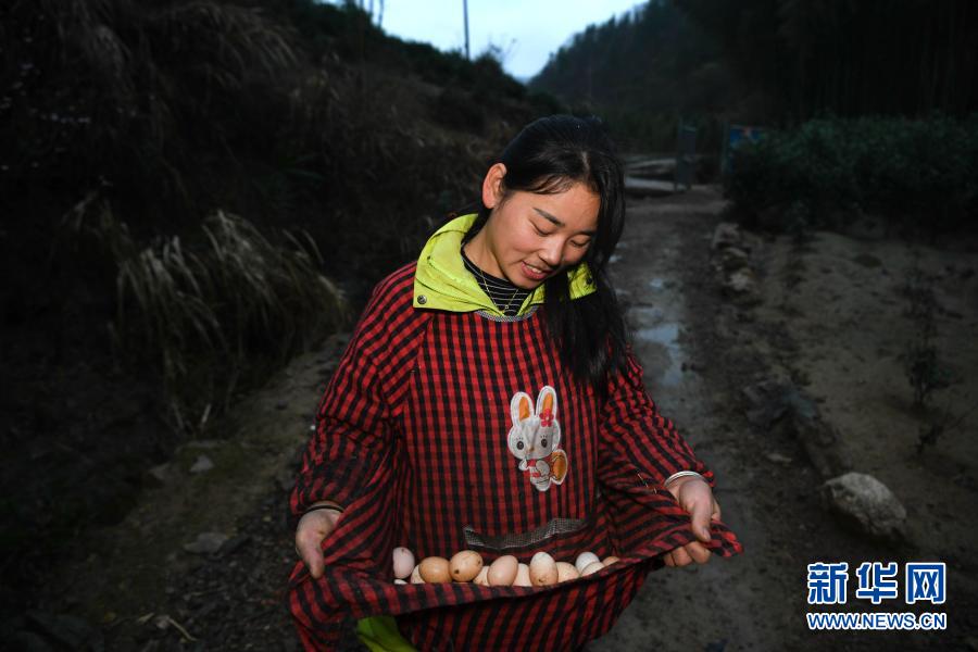 張志菊從自家農(nóng)場(chǎng)撿回雞蛋(2月25日攝)。