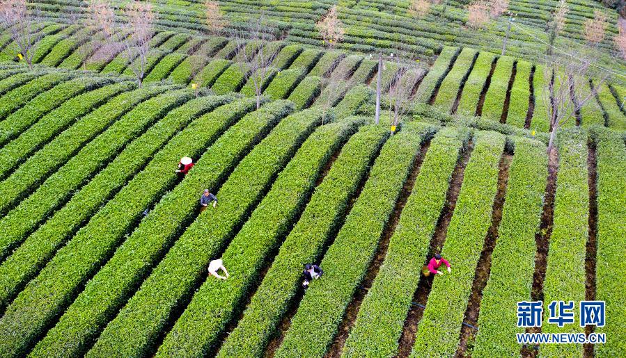 3月4日,茶農(nóng)在安康市漢濱區(qū)流水鎮(zhèn)剛子茶葉專業(yè)合作社標(biāo)準(zhǔn)化茶園采摘新茶(無(wú)人機(jī)照片)。新華社記者 陶明 攝