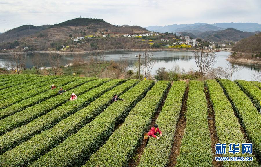 3月4日,茶農(nóng)在安康市漢濱區(qū)流水鎮(zhèn)剛子茶葉專業(yè)合作社標準化茶園采摘新茶(無人機照片)。新華社記者 陶明 攝