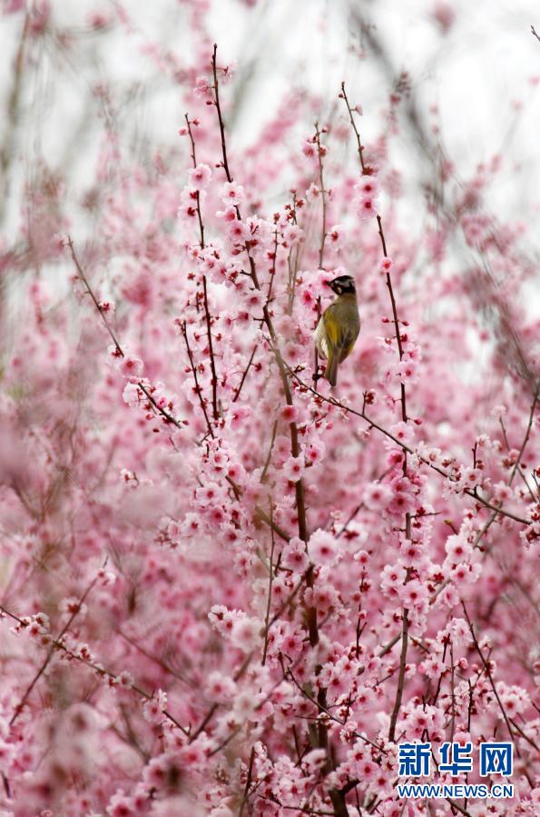 3月8日,在江蘇南京梅花山,一只小鳥在美人梅枝頭棲息。