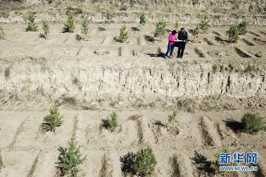 3月11日,在平?jīng)鍪嗅轻紖^(qū)白水鎮(zhèn)焦莊村北山,張文玉(左)和同事討論植樹(shù)造林細(xì)節(jié)(無(wú)人機(jī)照片)。