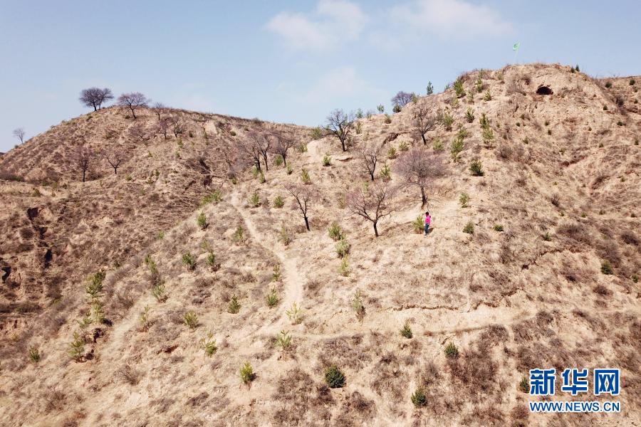 3月11日,在平涼市崆峒區(qū)白水鎮(zhèn)焦莊村北山,張文玉在山坡上查看栽植的油松(無人機照片)。