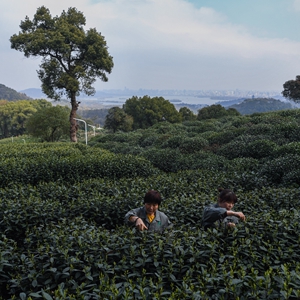 3月12日,在位于杭州市西湖風(fēng)景名勝區(qū)滿覺隴村白鶴峰的西湖龍井茶葉基地,茶農(nóng)在采摘西湖龍井頭茶,遠(yuǎn)處就是杭州西湖。
