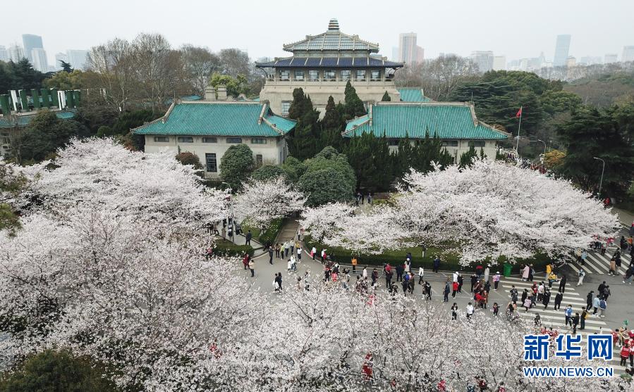 3月13日,來(lái)自各地的援鄂醫(yī)護(hù)人員在武漢大學(xué)校園共赴櫻花之約(無(wú)人機(jī)照片)。新華社記者 程敏 攝