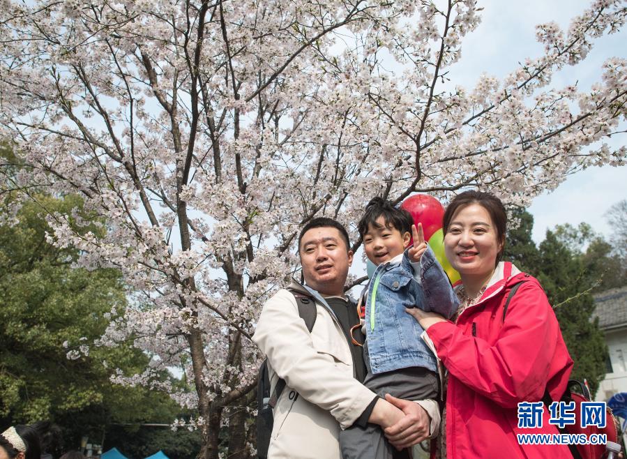 3月13日,遼寧援鄂醫(yī)療隊丹東市中心醫(yī)院護士李杰(右)與家人在武漢大學櫻花樹下合影。新華社記者 肖藝九 攝