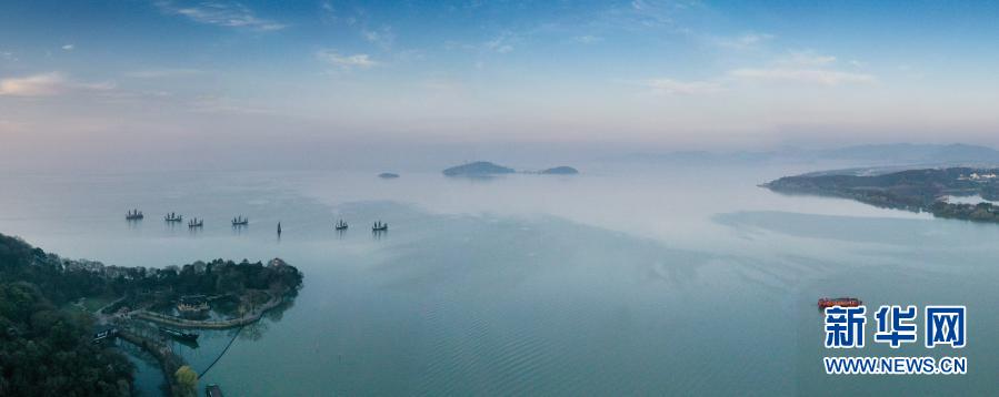3月13日拍攝的江蘇省無錫市太湖黿頭渚景區(qū)晨景(無人機(jī)全景照片)。