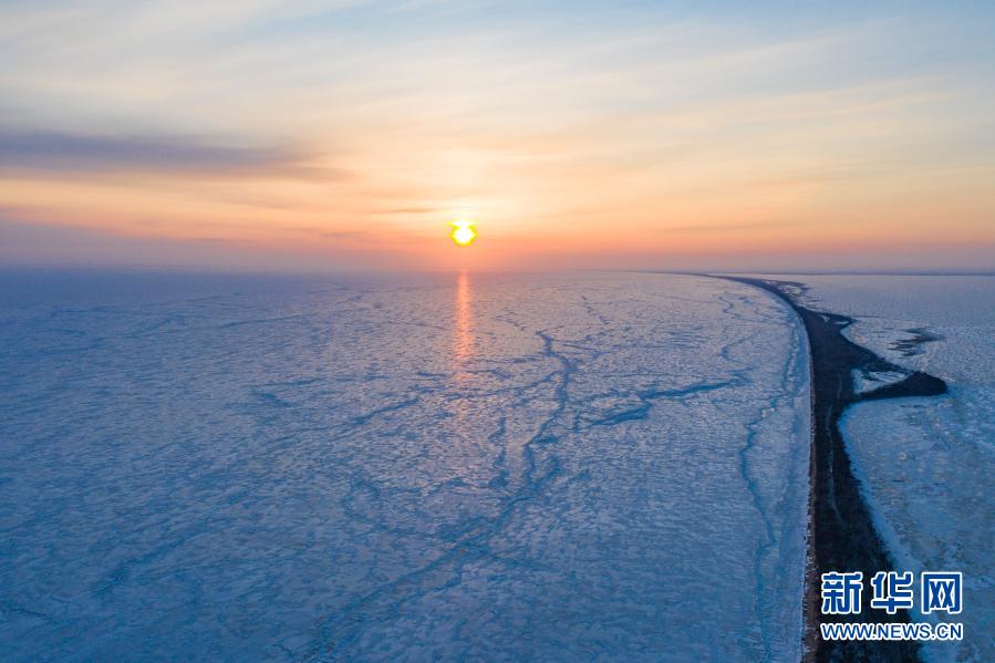 3月13日拍攝的夕陽(yáng)下的興凱湖(無(wú)人機(jī)照片)。