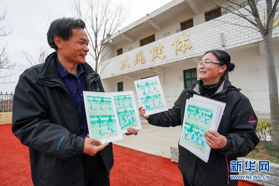騎路小學(xué)劉彥老師(右)和校長劉恩展示以學(xué)生命名的花樣跳法卡片(3月9日攝)。新華社記者 李博 攝