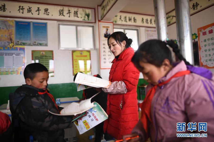 3月16日,索加鄉(xiāng)寄宿小學(xué)數(shù)學(xué)老師卓瑪才吉(左二)在課后輔導(dǎo)學(xué)生功課。新華社記者 駱曉飛 攝