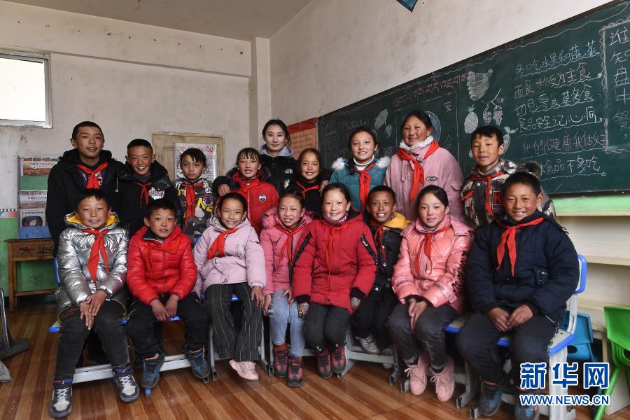 3月16日,在索加鄉(xiāng)寄宿小學,查日老師(后排中)和學生在一起。新華社記者 駱曉飛 攝
