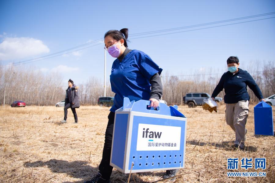 3月20日,北京猛禽救助中心猛禽康復(fù)師戴暢(中)和周蕾(右)將裝有大鵟的猛禽運(yùn)輸箱運(yùn)至放飛場地。