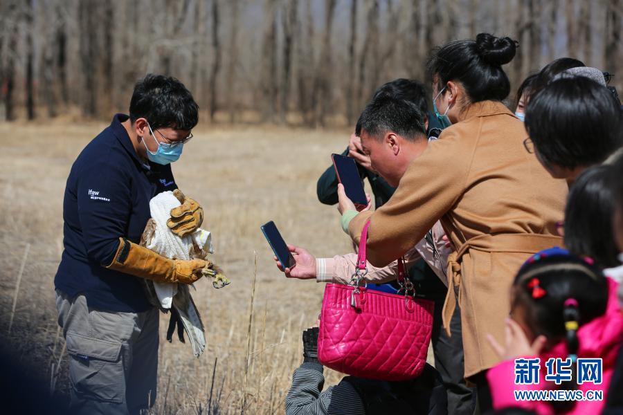3月20日,救助大鵟的市民朱海鶇(左二)在拍攝大鵟的環(huán)志。新華社記者 李京 攝