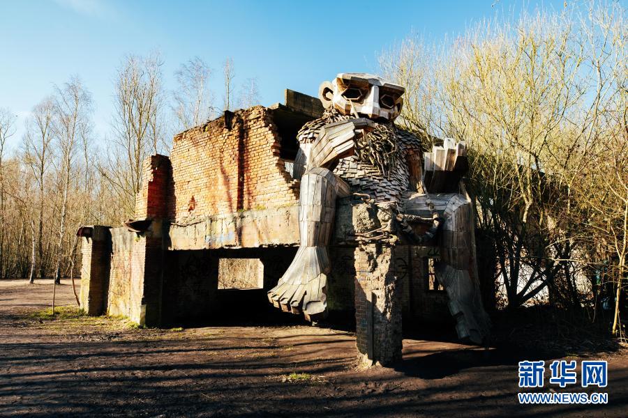這是3月20日在比利時(shí)博姆市的德舒爾森林公園拍攝的一座“巨人”雕塑。新華社記者 張鋮 攝