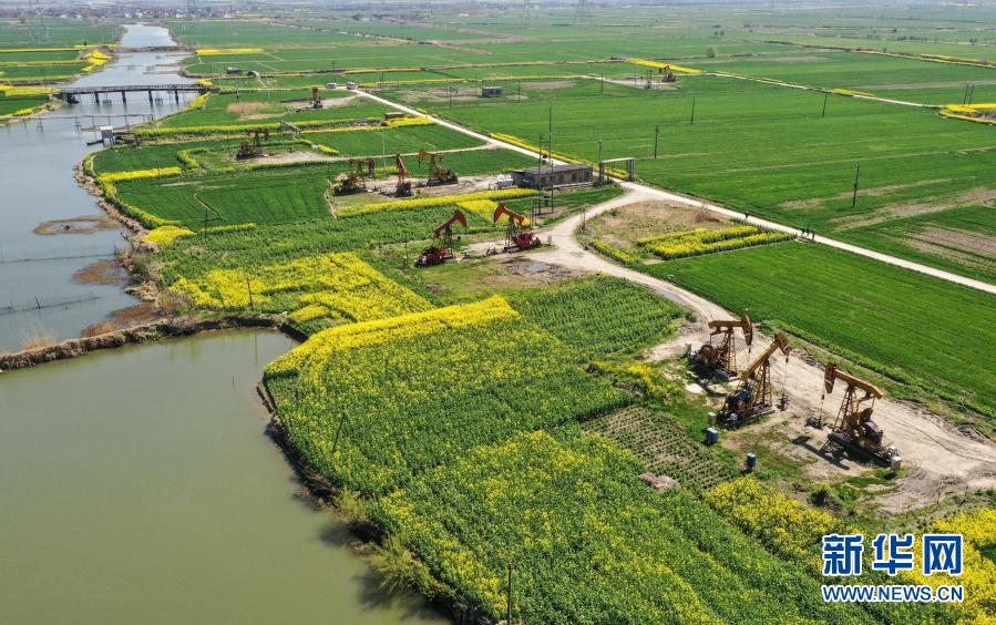 3月23日,在江蘇油田陳堡采油班站,采油機(jī)組在工作中(無人機(jī)照片)。