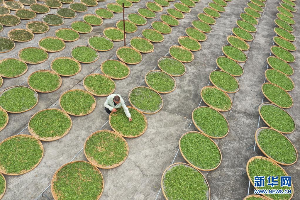 4月2日,制茶師傅在福鼎市佳陽畬族鄉(xiāng)的一家茶企業(yè)內(nèi)攤放茶青。新華社記者 林善傳 攝