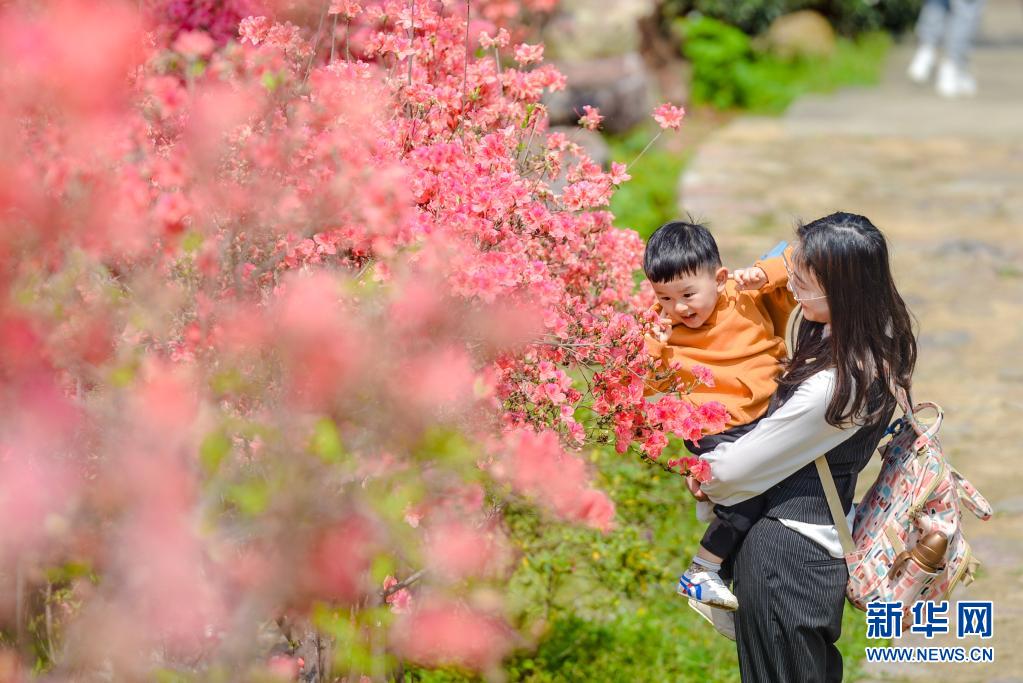 4月5日,一對母子在浙江省湖州市長興縣和平鎮(zhèn)城山溝景區(qū)內(nèi)觀賞杜鵑花。