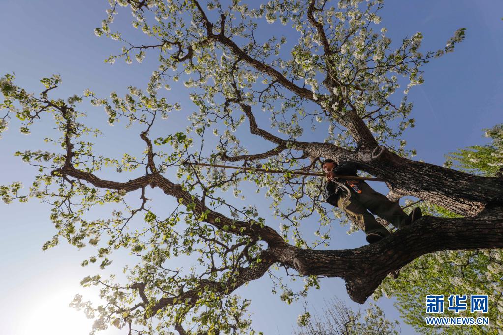 4月6日,河北唐山遵化市鐵廠鎮(zhèn)東平臺村的農(nóng)民在果園管護梨樹。