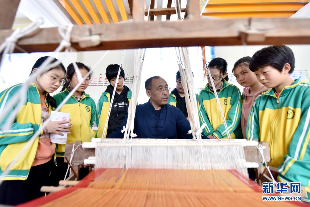 4月7日,威縣土布紡織技藝傳承人高慶海在威縣第四小學(xué)向?qū)W生講解老粗布紡織技藝。近年來(lái),河北省邢臺(tái)市威縣積極開(kāi)展“非遺傳承進(jìn)校園”活動(dòng),將當(dāng)?shù)靥厣沁z項(xiàng)目引入學(xué)校課堂,讓學(xué)生近距離感受民間傳統(tǒng)技藝的魅力,促進(jìn)非遺文化的保護(hù)和傳承。新華社記者 朱旭東 攝