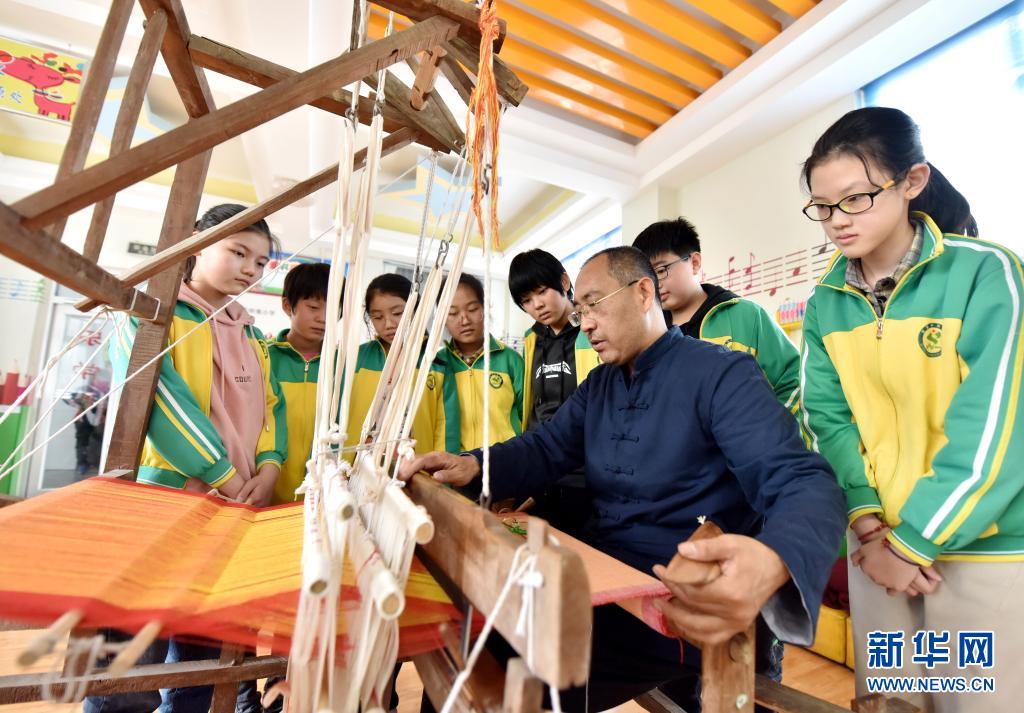 4月7日,威縣土布紡織技藝傳承人高慶海在威縣第四小學(xué)向?qū)W生演示老粗布紡織技藝。近年來,河北省邢臺市威縣積極開展“非遺傳承進(jìn)校園”活動,將當(dāng)?shù)靥厣沁z項(xiàng)目引入學(xué)校課堂,讓學(xué)生近距離感受民間傳統(tǒng)技藝的魅力,促進(jìn)非遺文化的保護(hù)和傳承。新華社記者 朱旭東 攝