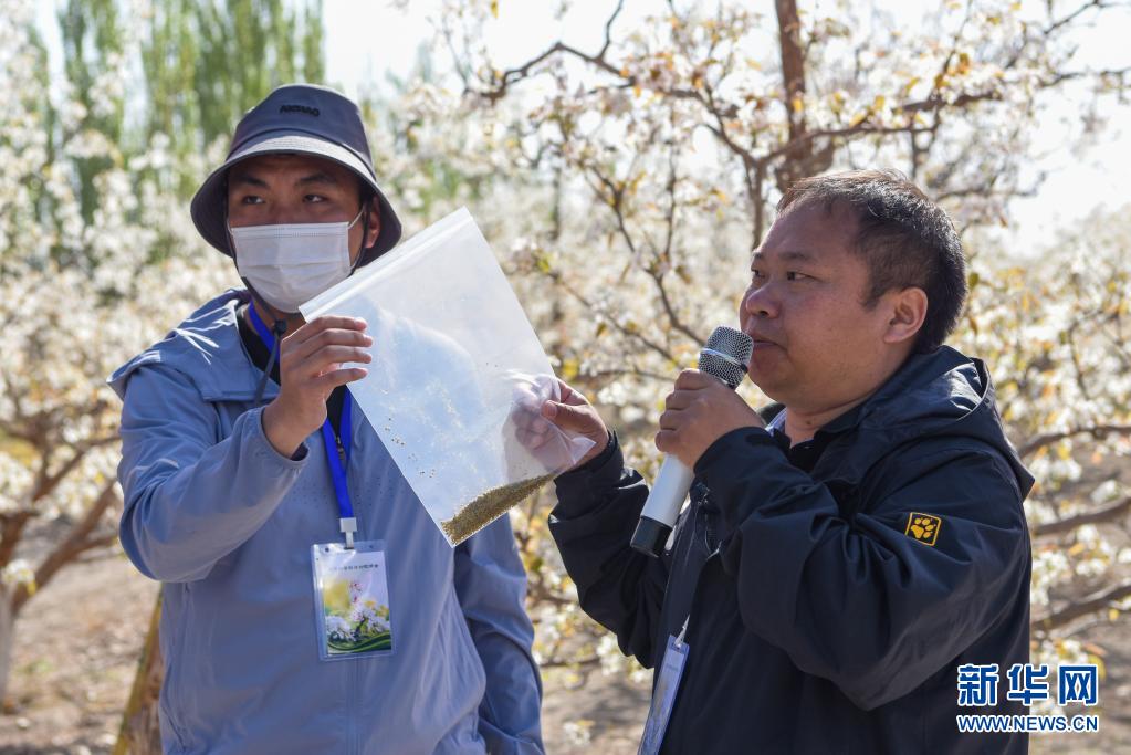 4月11日,在鐵門(mén)關(guān)市一處香梨示范園,技術(shù)人員展示蜜蜂采集的高活性花粉。新華社記者 丁磊 攝