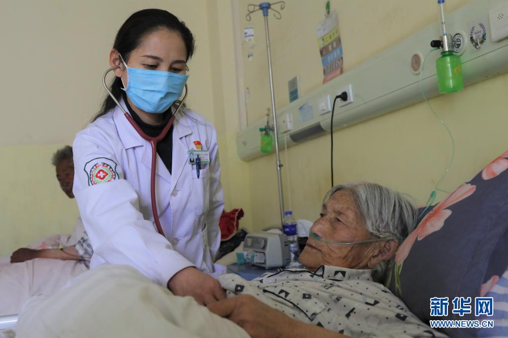 青海省玉樹藏族自治州玉樹市八一醫(yī)院內(nèi)科醫(yī)生尼樣卓瑪在為患者查體(4月12日攝)。
