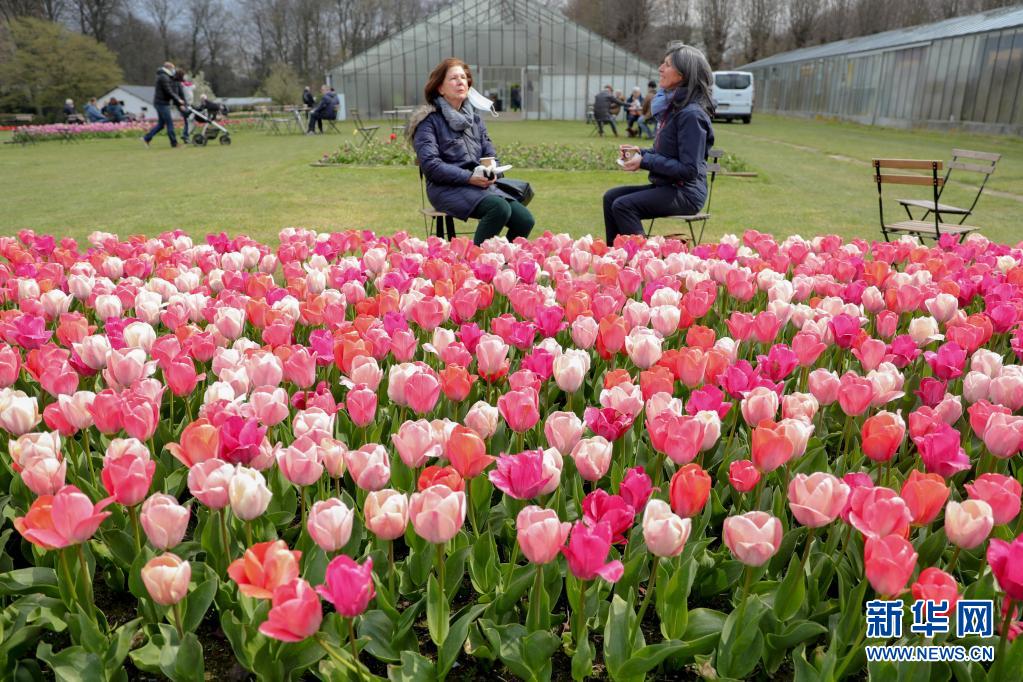 4月14日,參觀者坐在比利時布魯塞爾以西的拜加登城堡的鮮花旁休息聊天。