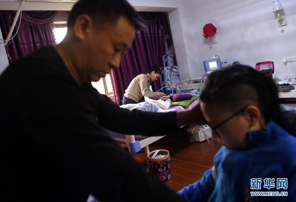 包宗鋒、黃飛釵夫婦在家中照看包珍妮姐弟二人(4月14日攝)。包珍妮的弟弟也是一名脊髓性肌萎縮癥患者。
