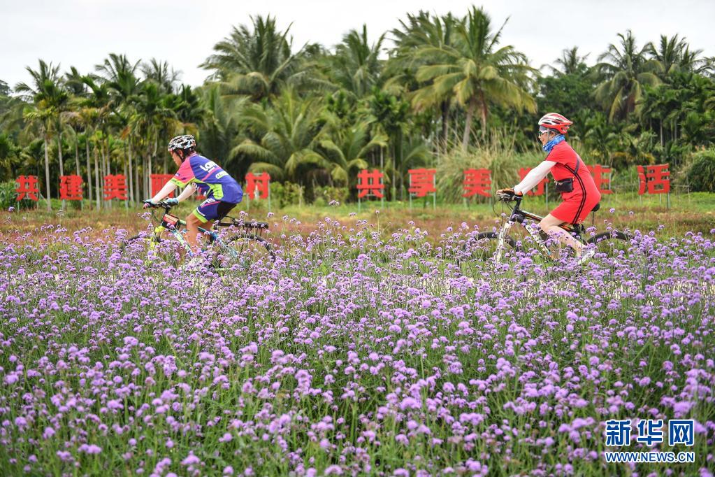 4月9日,游客在海南博鰲鎮(zhèn)南強村花海中騎行。