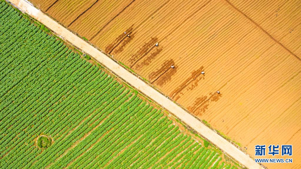 4月20日,貴州省六盤(pán)水市六枝特區(qū)木崗鎮(zhèn)農(nóng)民在田地里勞作(無(wú)人機(jī)照片)。