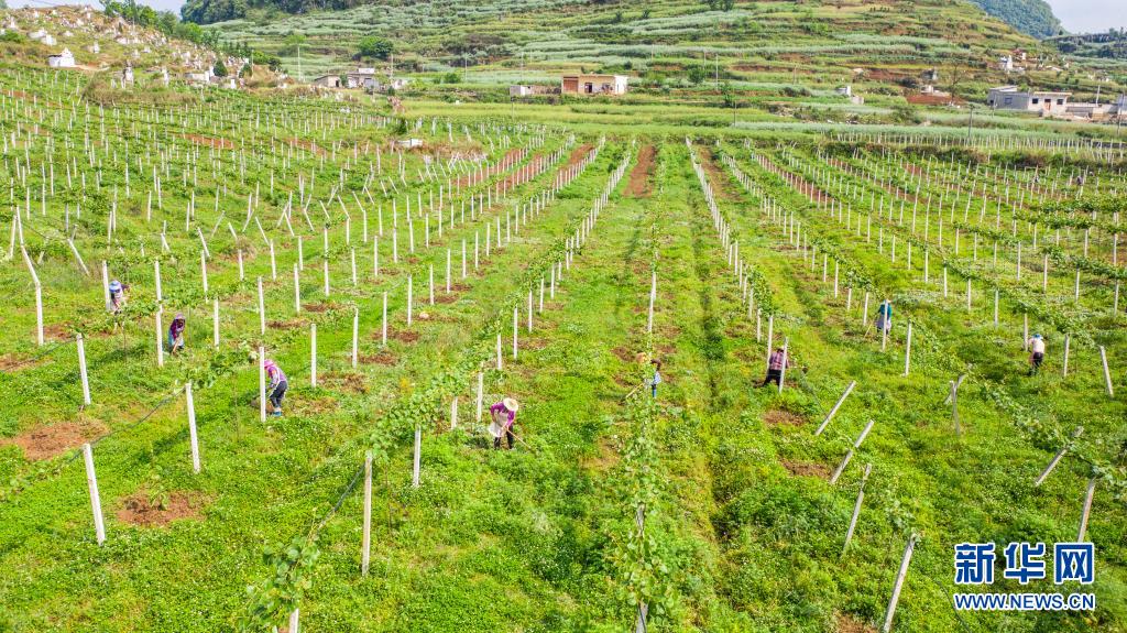 4月20日,貴州省六盤水市六枝特區(qū)木崗鎮(zhèn)農(nóng)民在田地里勞作(無人機(jī)照片)。