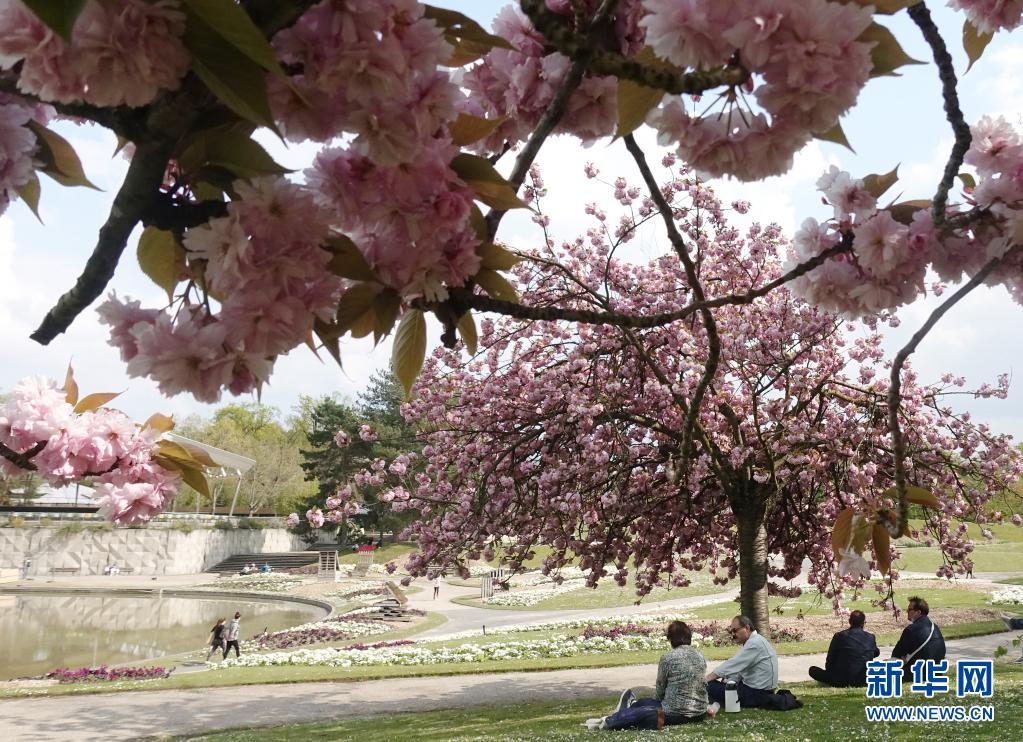 4月21日,人們?cè)诜▏屠枰惶幑珗@的櫻花樹下休閑。